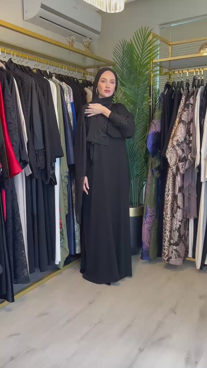 Boncuk işlemeli özel şalıyla tam bir set olarak sunulan Dihla Ferace, Dubai ipeğinin dökümlü zarafetini taşır. Önü çıtçıtlı tasarımıyla pratik kullanım sağlarken, lüks detaylarıyla modern ve şık bir görünüm kazandırır. Standart beden (38–46) aralığıyla rahat bir uyum sunar.