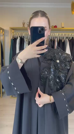 İç elbisesi ve şalıyla birlikte takım olarak tasarlanan bu abaya, hem özel günlerde hem de davetlerde vazgeçilmez bir tercih olacak.