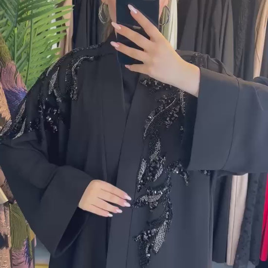 Payet kaplamalı ince işçiliğiyle zarafeti ön plana çıkaran Ghia Abaya, iç elbisesiyle tam bir set olarak ve standart beden seçeneğiyle sunuluyor. Modern kesimi, ışıltılı detayları ve dökümlü yapısıyla hem konforlu hem de şık bir kullanım sağlar.