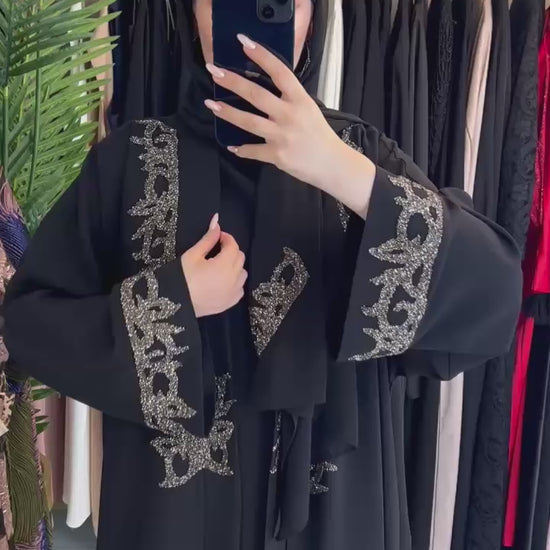 Çift taraflı taş işçiliğiyle göz alıcı bir şıklık sunan New Elegant Abaya Set, özel günleriniz için özenle tasarlandı.